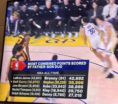现在詹姆斯父子和库里父子,一个拼爹一个拼儿子,不知道这最后父子得分排行榜,谁会是第一呢?(下图为昨天库里父子得分超越科比父子得分瞬间)